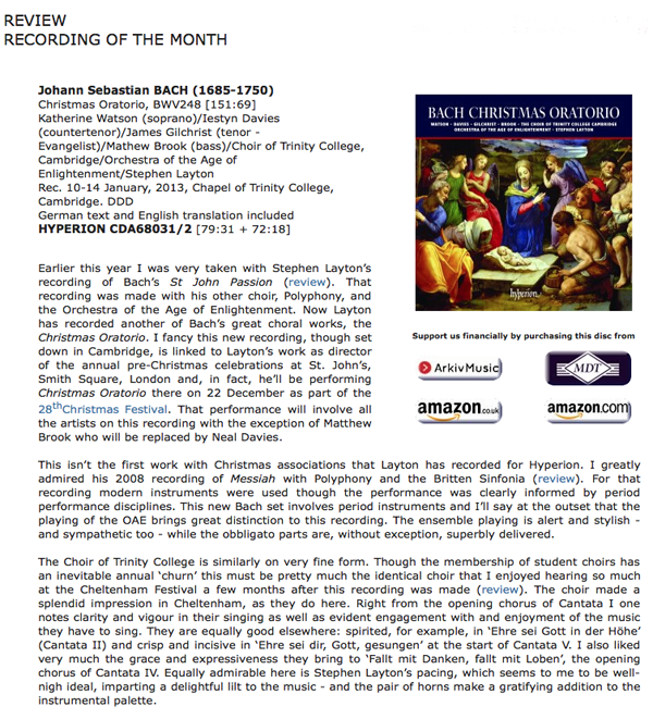 "... the 38 mixed voices of Trinity College Choir [are] very well trained, especially in matters of firm text enunciation... The soloist line-up is in general superior both technically and interpretatively, especially the ever-incisive James Gilchrist … The Orchestra of the Age of Enlightenment sounds thoroughly at home (David Blackadder gives a very suave trumpet solo in 'Grosser Herr') and Stephen Layton conducts with care and expertise" (Gramophone Magazine, 2013)