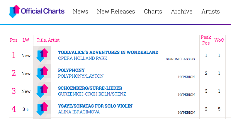 The disc is currently No. 2 in the Official Specialist Classical Music chart.