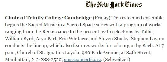 The first concert of the tour is in the Church of St Ignatius Loyola, New York City, and is part of the Sacred Music in Sacred Space series.